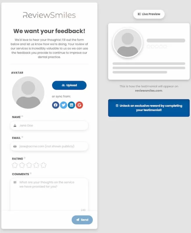 One of the unique features of the review landing page is that if a client leaves you a 5 star review you can then send them directly to leave you a review on a third-party platform like Google, Facebook, or Yelp.
